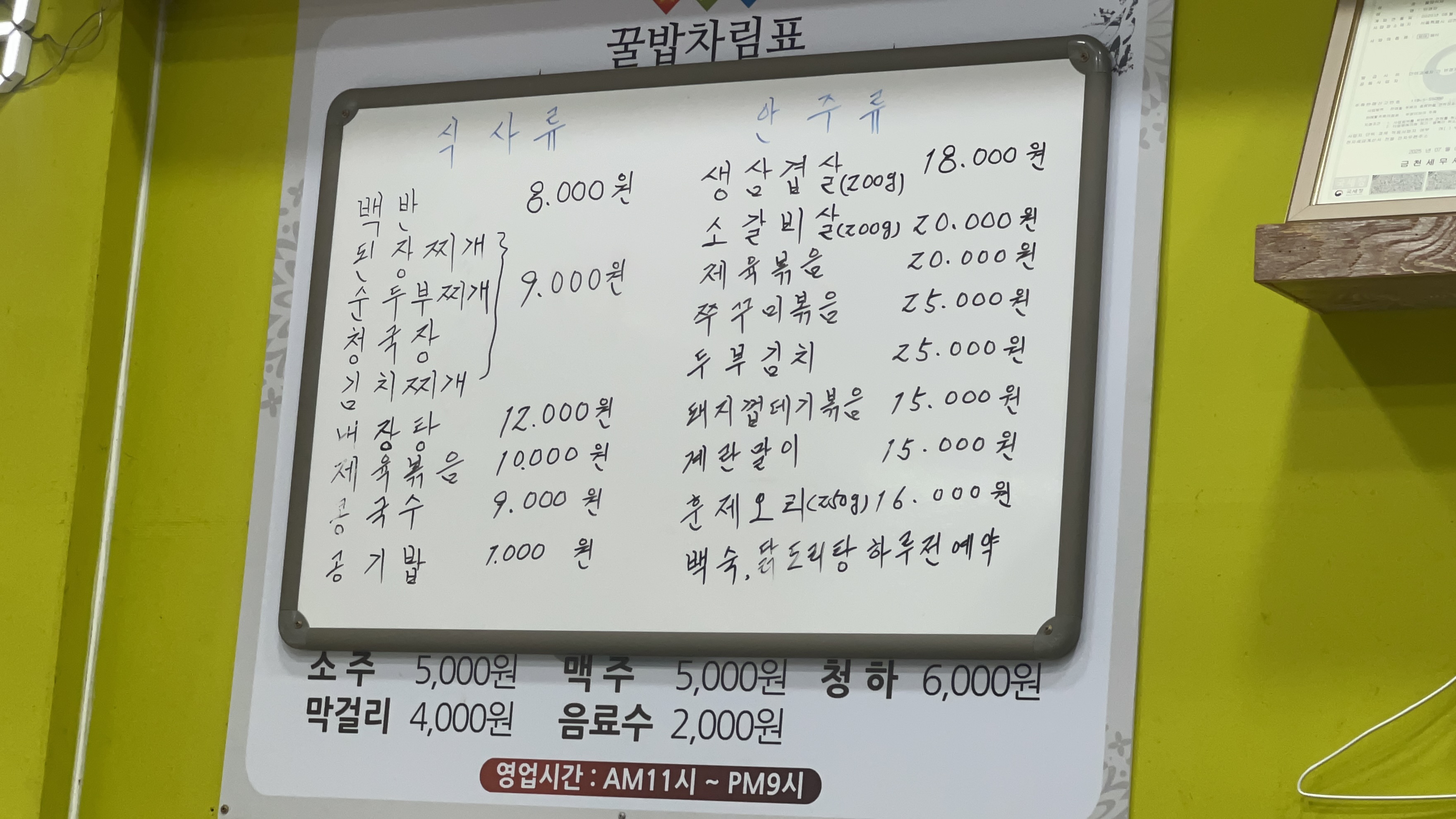 가게명: 꿀밥 위치: 가산디지털단지역 인근 메뉴: 백반, 제육볶음, 김치찌개, 된장찌개 등 가격대: 8,000원 ~ 10,000원 영업시간: 평일 11:00 ~ 21:00 (주말 휴무) 분위기: 가정식 백반집