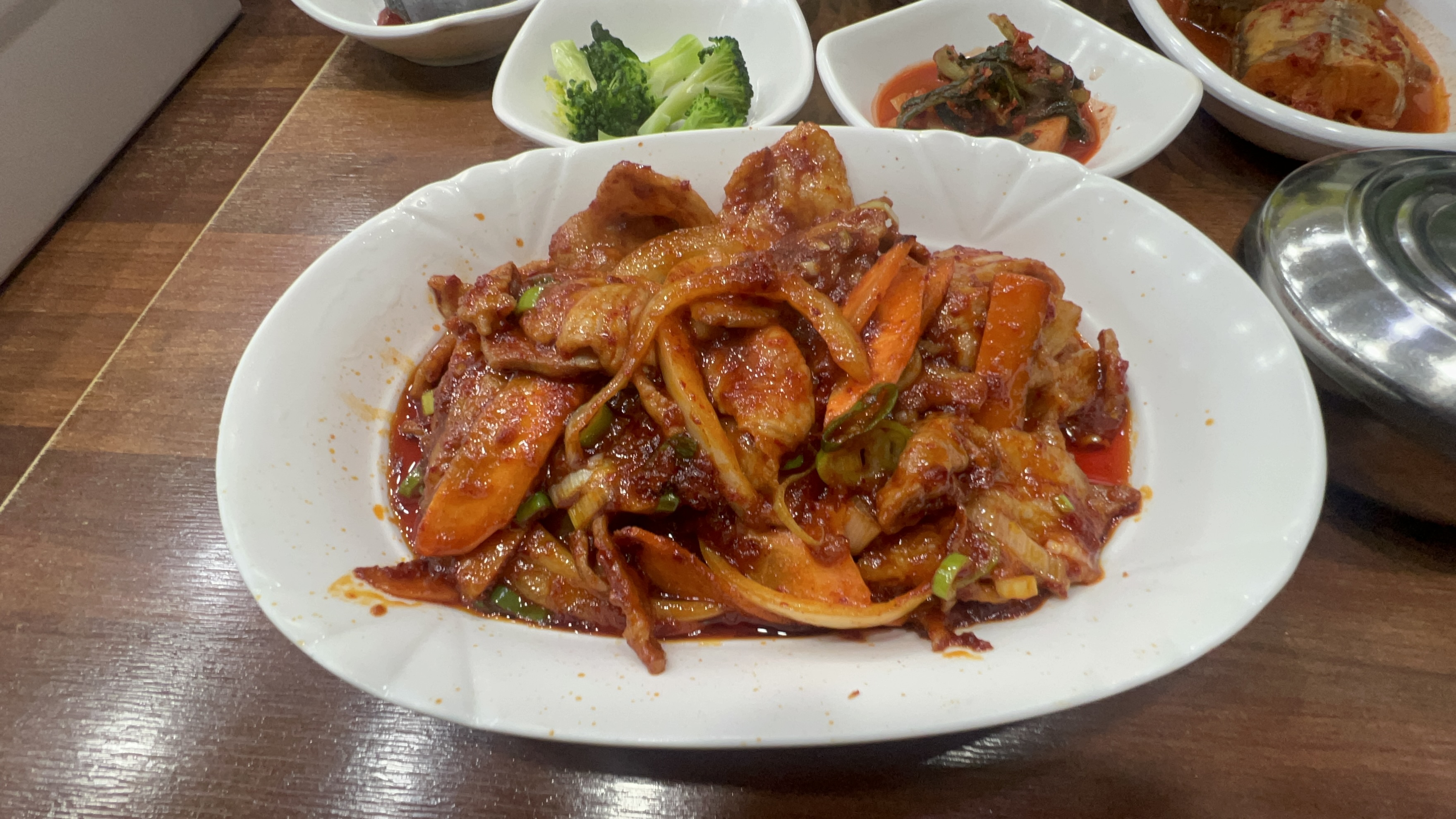 제육볶음이 큼지막한 접시에 담겨 나옵니다. 양이 정말 푸짐해서 첫눈에 **"와, 이거 다 먹을 수 있을까?"**라는 생각이 들 정도예요.
